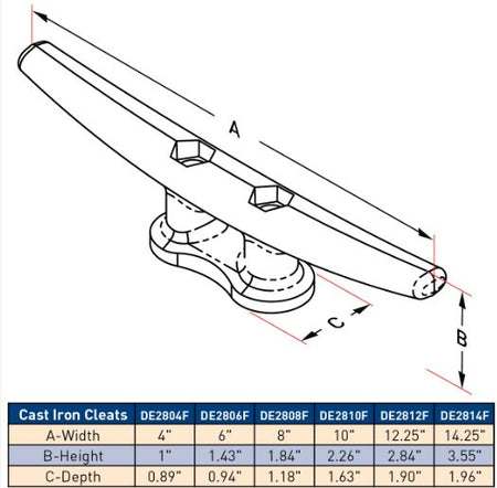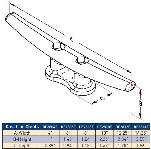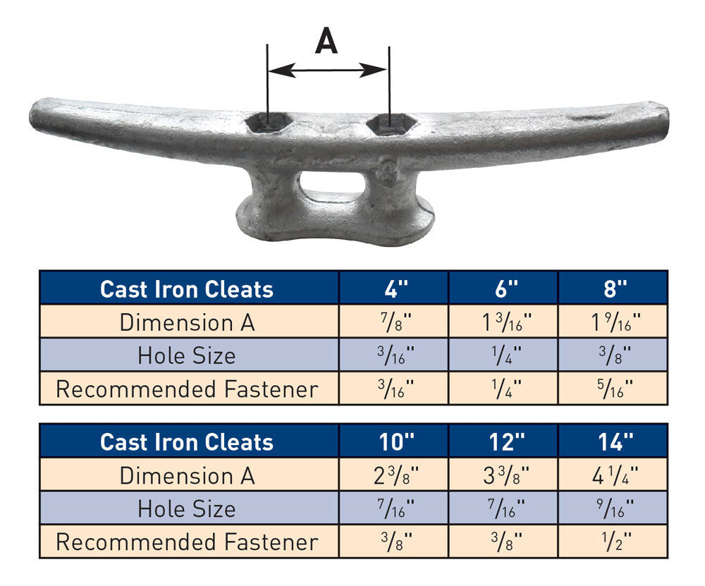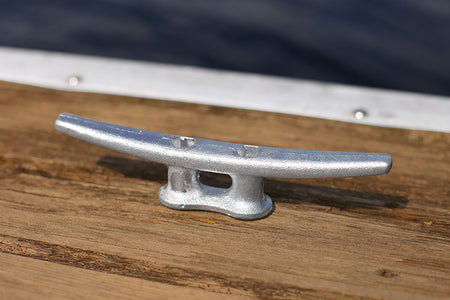 These are your traditional, cast iron, hot dip galvanized Dock Cleats. The mounting holes are recessed with a hexagonal shape to stop the head of a carriage bolt from turning. This eliminates the need to use tow wrenches when mounting.