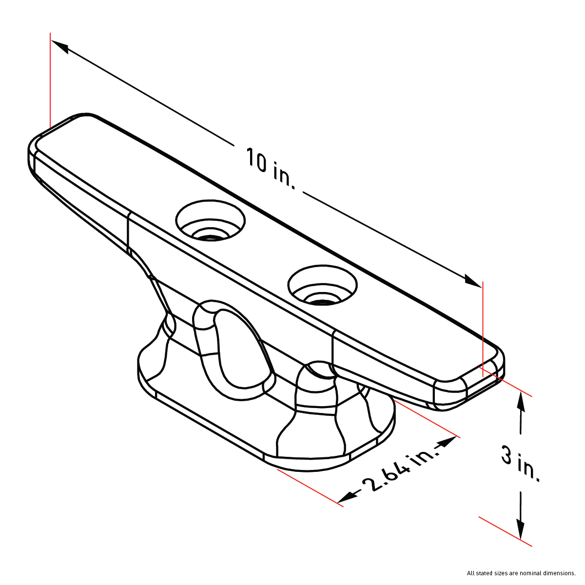 Dock Edge aluminum open base cleat is designed with an extra wide footprint for added strength. As well, each cleat has an enlarged counter-sunk hole for easy installation with a socket. Can be through bolted or lag bolted.