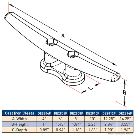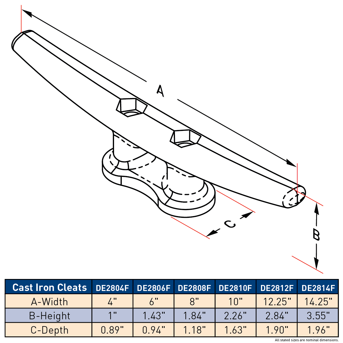 These are your traditional, cast iron, hot dip galvanized Dock Cleats. The mounting holes are recessed with a hexagonal shape to stop the head of a carriage bolt from turning. This eliminates the need to use tow wrenches when mounting.