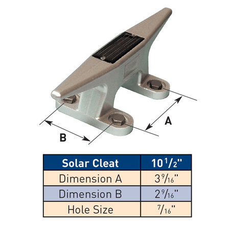 Dock Edge solar cleat is attractive and functional with powerful solar charging performance & mooring strength. This 10" solar cleat is manufactured from cast aluminum alloy with a wide and sturdy base footprint. It has an automatic on at dusk, with a viewing distance of 325 feet.