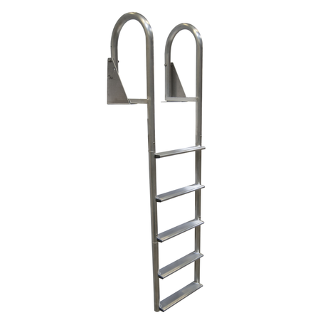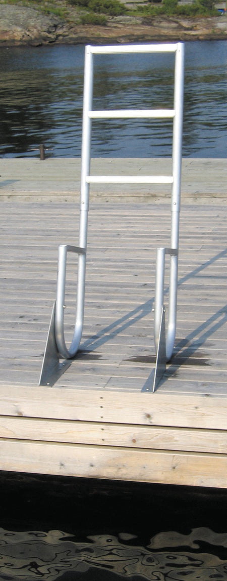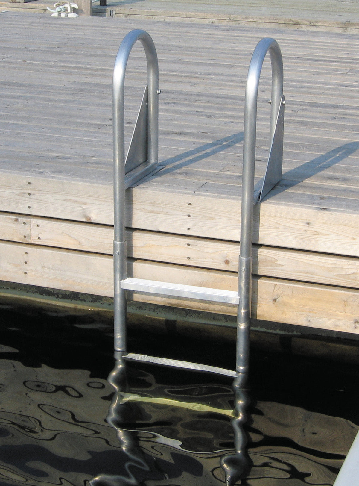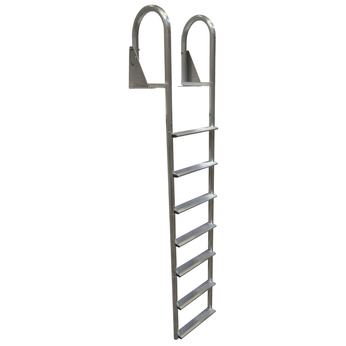 Dock Edge wide step welded aluminum flip-up ladders come with 4" (10 cm) x 16.75" (42.5 cm) ribbed anti-slip steps. These ladders flip up and out of the water when not in use, and are easily secured in the up or down position with a handy retainer pin. Clean, smooth, mill finish aluminum and welded construction. Large diameter gables and rails for strength and a sure grip. Easy to assemble & includes stainless steel hardware. 665lb (300kg) capacity. Made from marine grade aluminum.