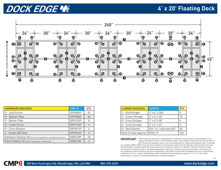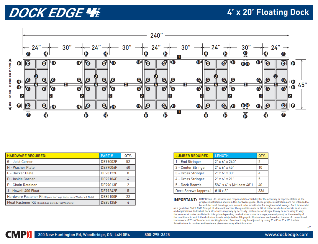 The Dock-2-Go PLUS Modular Dock Kit includes all heavy-duty, hot dip galvanized mounting hardware and floatation you need required to assemble a 4' x 20' (1.2m x 6.1m) modular floating dock. Each kit may be utilized to construct a stand-alone dock or may be attached to another Each kit may be utilized to construct a stand-alone dock or may be attached to another Dock 2 Go section using a Dock 2 Go modular connector kit (DE85205F) to increase dock length or width as required.